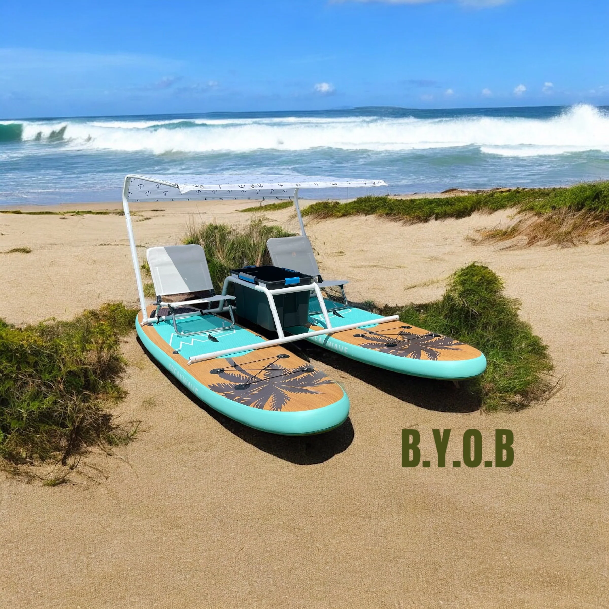 Two inflatable SUP boards are attached to a stainless frame system via heavy duty ratchets and straps.